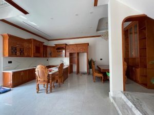 Phòng bếp được thiết kế hiện đại và tiện nghi, với đầy đủ các trang thiết bị như bếp, kệ bếp, bàn ăn đều dùng là nội thất gỗ cao cấp, độc đáo mang đậm phong cách riêng cho ngôi biệt thự của Chị Quỳnh. Phòng bếp được thiết kế với cửa sổ rộng, thoáng và kết hợp trồng cây xanh ở các góc cạnh căn bếp giúp cho không gian trở nên thoáng mát và thoải mái khi nấu nướng và dùng bữa.