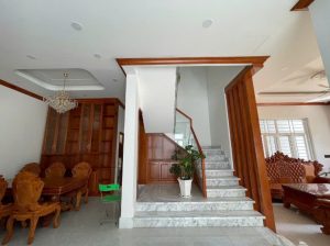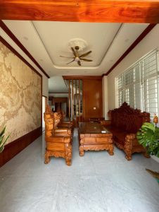 Đi thẳng vào bên trong là không gian phòng khách rộng rãi và thoáng mát, đặt biệt là tất cả nội thất được trang trí sang trọng như sofa, ghế, bàn, tủ hoàn toàn bằng gỗ tự nhiên với những cây có tuổi đời lâu năm, chất gỗ cứng cáp.